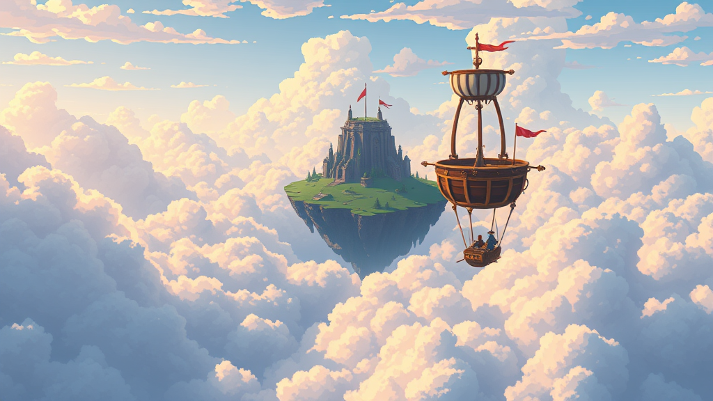 16 bit pixel art, captivating scene of an adventurer in a small airship approaching a floating island amidst the clouds, inspired by studio ghibli, cinematic atmosphere, high dynamic range scenic view, --ar 2:3