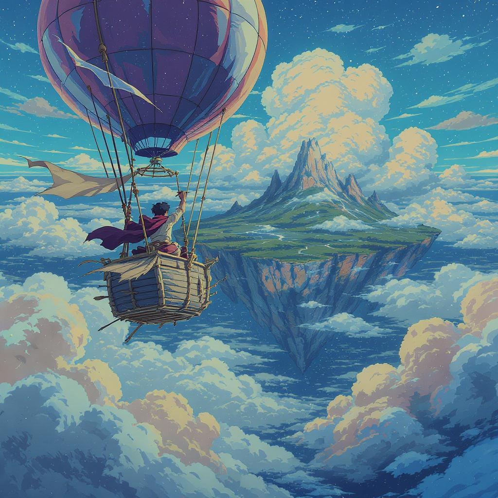 16 bit pixel art of an adventurer in a small airship approaching a floating island surrounded by clouds, inspired by Studio Ghibli, with a dramatic composition capturing the scene as if it's a cinematic moment, enhanced with vibrant colors and fine detail reminiscent of HDR, capturing a sense of wonder and exploration in a vertical 2:3 aspect ratio.