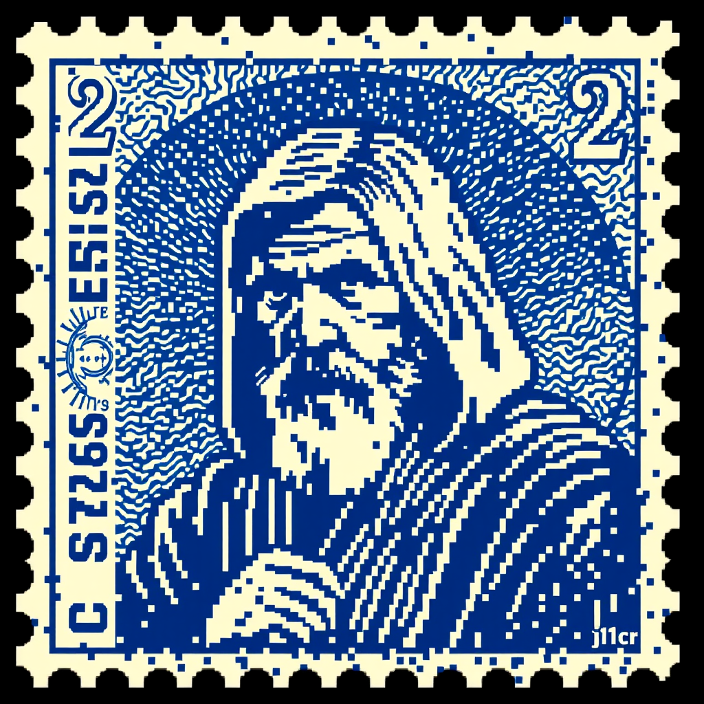 16 bit pixel art style, vintage-inspired United States postage stamp featuring Obi Wan Kenobi, designed as a 2 cent stamp. The artwork utilizes blue ink with a line engraving and intaglio effect for depth, incorporating HDR qualities to enhance detail and contrast. Created using SAI Pixel Art techniques with subtle creative variations, maintaining a nostalgic yet unique appearance.