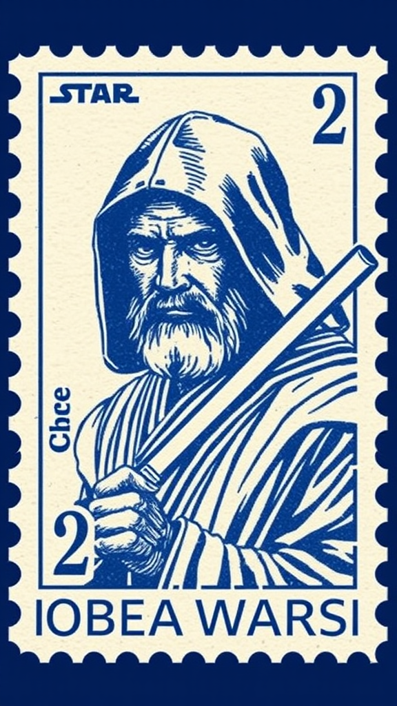 16 bit pixel art style, vintage USA postage stamp design, Obi Wan Kenobi figure, 2 cent denomination, rendered in blue ink, mixing line engraving and intaglio techniques, enhanced HDR effect, influence of SAI Pixel Art, retro-inspired elements with subtle creative adjustments.