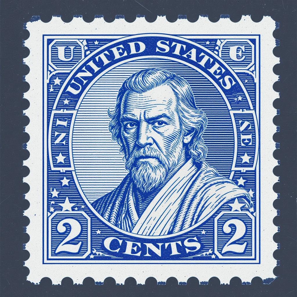 View this AI-generated image featuring 16 bit pixel art of a vintage united states postage stamp featuring obi wan kenobi designed as a 2 cent stamp using shades of blue ink the artwork resembles a detailed line engraving with intaglio elements enhanced with hdr effects for depth and crafted in the
