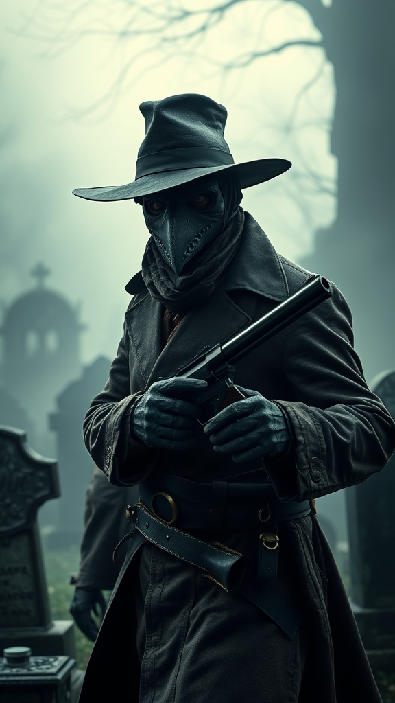 17th century plague doctor navigating a fog-laden graveyard, wearing a wide-brimmed hat and eerie bird-like mask, clad in weathered leather. An antique 6-shooter revolver rests in a holster at his side. The atmosphere is steeped in EPIC fantasy, illuminated by cinematic lighting that casts dramatic shadows, highlighting the doctor's detailed features. The scene is rendered in a hyper-realistic style, utilizing advanced digital techniques to vividly capture the complexity of the medieval environment, with every element in sharp focus, evoking a photorealistic impression enriched with small creative tweaks for a unique storytelling edge.