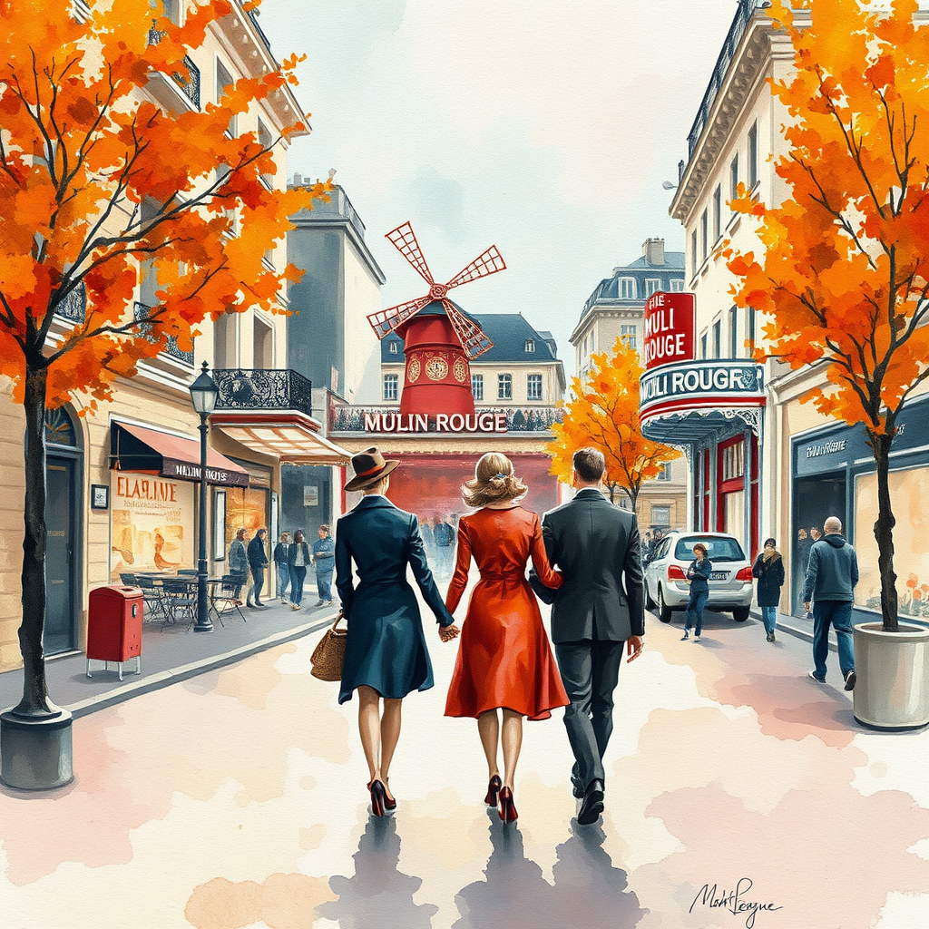 1950s Parisian scene with a watercolor depiction in the style of Mark League, showcasing lovers strolling hand-in-hand in the autumnal streets near the iconic Moulin Rouge. The painting features a skillful composition with a rough texture, capturing the early evening ambiance with hues of pink champagne. The atmosphere is warm and romantic, highlighting the stylish attire of the era and the vibrant, golden foliage of autumn, bringing a nostalgic charm to the cityscape.