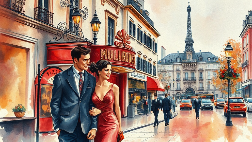 1950s Parisian street scene featuring lovers strolling near the Moulin Rouge, enveloped in the warmth of an early evening autumn glow. In the style of a master watercolorist, the painting captures the essence of Mark League’s skillful composition with a rough texture that accentuates the nostalgic charm of the era. The lovers, elegantly dressed, are bathed in a soft, romantic palette reminiscent of pink champagne. The backdrop is a lively Paris, with vivid strokes depicting the vibrant, yet serene, ambiance of the famed city during autumn.