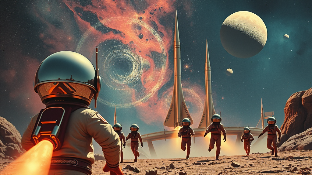 1950s retro futuristic science fiction scene showcasing space travel with sleek, chrome-plated rockets and astronauts in classic, bulbous helmets set against a vivid cosmic backdrop filled with swirling nebulae and distant planets. Inspiration from Bruce Pennington's distinctive use of intense colors and detailed compositions. The scene is captured from a ground-level perspective, utilizing the depth and detail brought by a Kodak Master View 8x10 camera with a Fujinon C 240mm f/9 lens on Kodak Ektar 100 film.