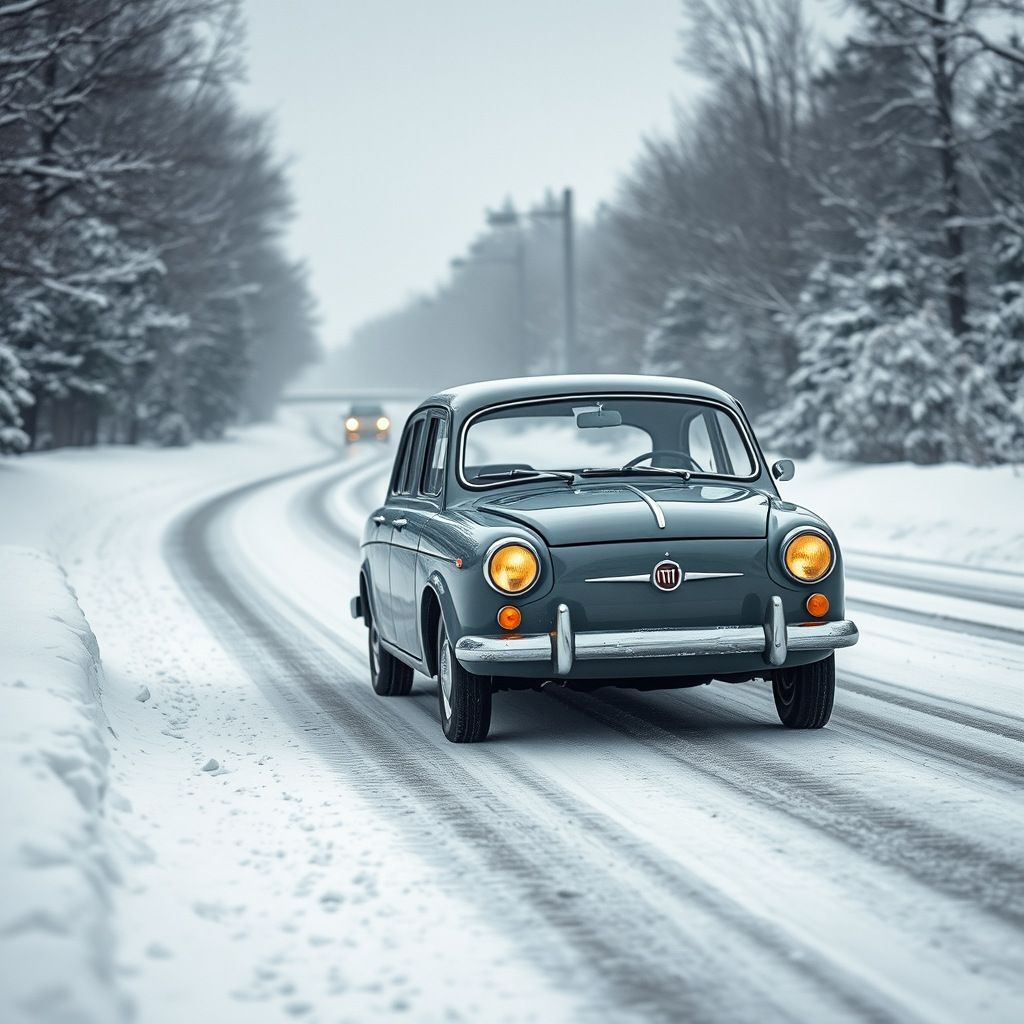 1960 grey Fiat sedan navigating a snowy winter road, with a contemporary twist and hyper-realistic details.