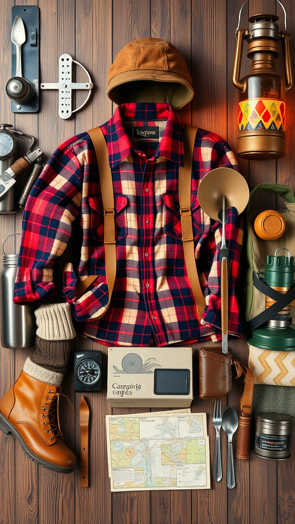 1960s-inspired camping wear arranged in a meticulously organized knolling style, featuring vibrant, photorealistic details of classic outdoor attire: vintage plaid flannel shirts, rugged leather hiking boots, thick woolen socks, canvas backpacks with leather straps, stainless steel camping utensils, retro thermos with colorful geometric patterns, weathered maps, traditional compass, and old-school lantern, all set against a textured wooden backdrop with subtle lighting to enhance the nostalgia of the era.