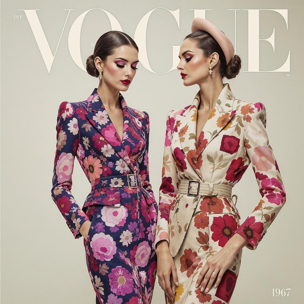View this AI-generated image featuring 1967 high fashion editorial featuring bold flower patterns and square motifs inspired by vogue showcasing sleek silhouettes and elegant tailoring the scene captures vibrant colors and striking contrasts emphasizing clean well defined lines and artistic expressi