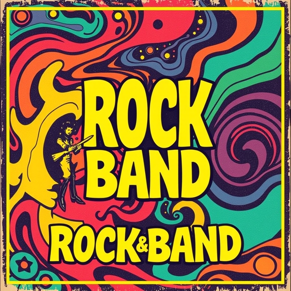 1970's rock band album cover art featuring a psychedelic design with bold, vibrant colors. The artwork is a vintage homage with swirling patterns and abstract shapes, capturing the essence of the era's creative spirit and musical energy. The design feels like a journey through a kaleidoscope of sound and color, evoking a sense of nostalgia and timeless rock and roll rebellion.