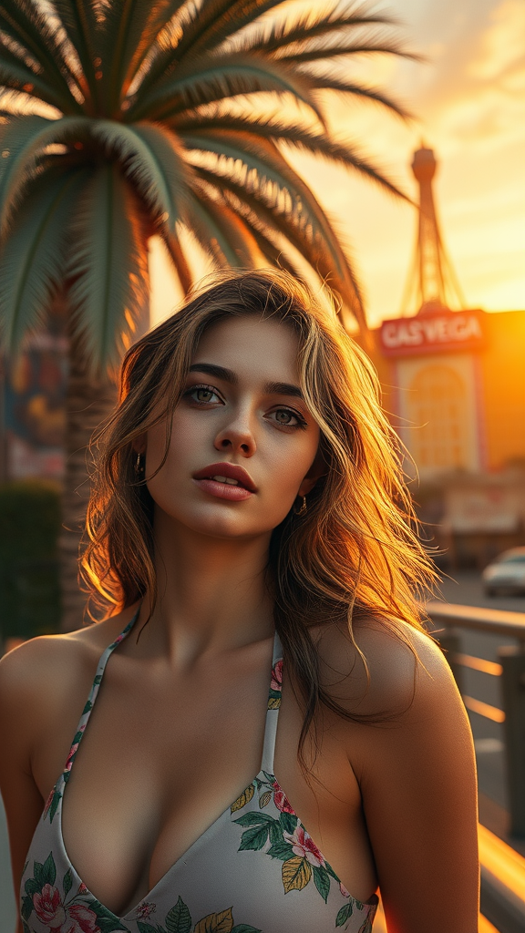1girl, 22 years old, intricately detailed, high quality, dramatic, ray tracing, photo-realistic, Ornate Tropical Las Vegas backdrop, during Golden hour, Ultra-realistic, Queercore-inspired art, broad lighting, film texture, vintage film camera, Circular polarizer, Sepia tones, Instagram aesthetic, UHD resolution, DSLR effects, drawings fusion, abstract elements, cartoon influences, surrealist touch, conceptual visuals, graphic elements, collage style, artistic exploration, intimate mood, handwritten note, artistic nude.