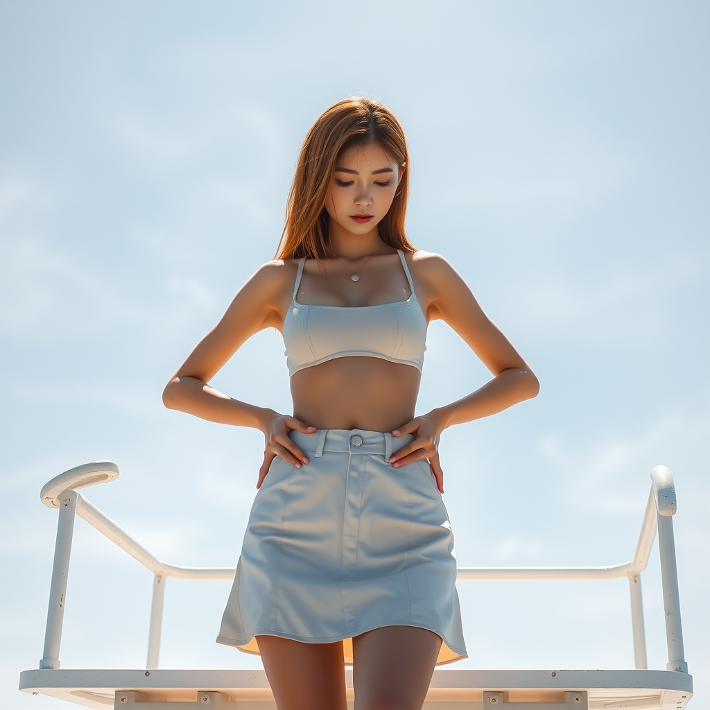1girl, a lifeguard poised with confidence, standing with hands on hips, gazing downwards thoughtfully, bathed in sunlight atop a white lifeguard tower, slender physique showcasing toned abs and ribs, modest flat chest, wearing an A-line skirt. Her hair is a striking rose gold, falling straight, ultra-realistic concept art capturing elegance with high detail and intricate textures. The scene is depicted in sharp focus with a captivating depth of field, medium shot at f/1.8 using an 85mm lens. The ambiance is enhanced by volumetric fog, giving a dreamy feel; trending aesthetics suitable for platforms like Instagram and Tumblr in HDR, 4k and 8k resolution. Asian-inspired elegance, avoiding common visual pitfalls like poor anatomy or low-quality features, ensuring a portrait that is clear, well-composed, and aesthetically pleasing.