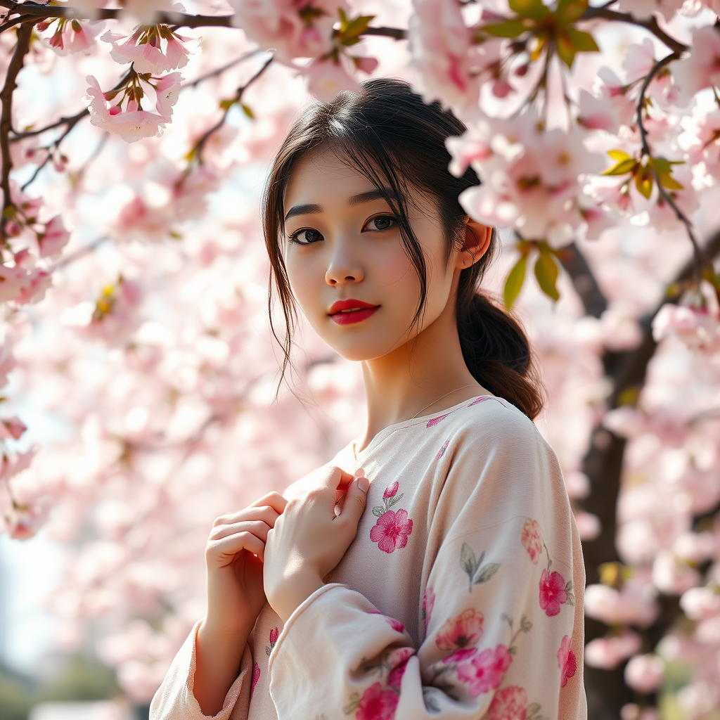 1girl, beautiful young woman, standing outdoors among blooming sakura trees, dramatic natural lighting, high detail RAW color photo, professional photography, ultra-high-resolution image, realistic texture, hyperrealism with rich colors, captured using an f1.6 lens, lifelike texture, vibrant cinestill 800 film look, enhanced realism using CGI elements, illustration and digital art inspirations, highly detailed scene with smooth gradations, realistic physics-based lighting, anime and cartoon influences blended with realistic portrayals, maintaining aesthetic harmony, beautifully rendered facial features and hands, finely detailed clothing and surroundings, captivating composition, pleasing proportions, high-quality representation without flaws or distortions, preserving natural beauty and authenticity, vivid and sharp focus, showcasing an engaging and enchanting atmosphere.