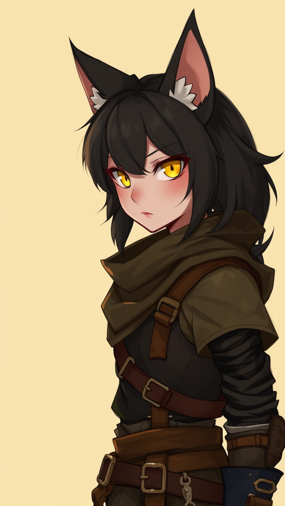 1girl, feline features, black fur, anthropomorphic character, animalistic nose and ears, cat-like girl, mid-length portrait, warm yellow and soft white tones, piercing yellow eyes, minimalist backdrop, rugged leather attire, stealthy rogue, skilled thief.