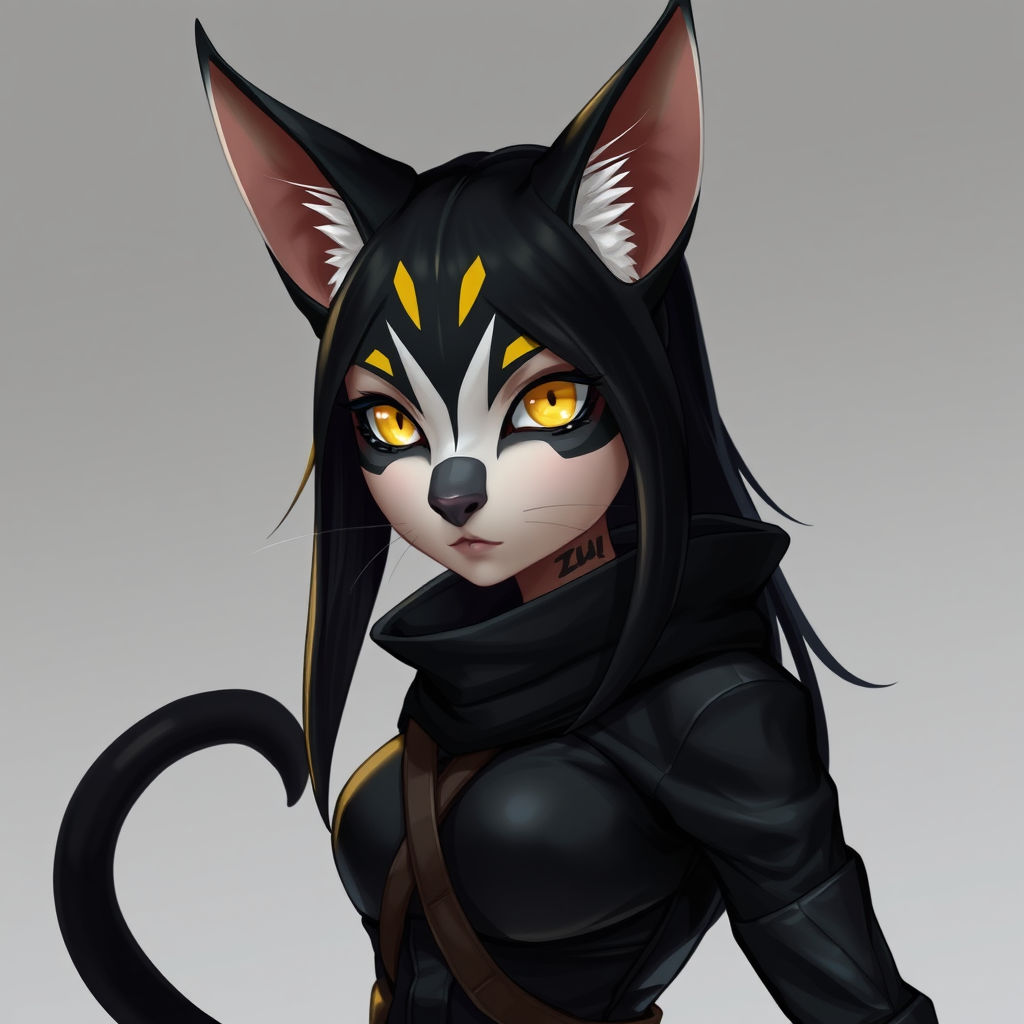 1girl, feline humanoid, tabaxi-inspired, sleek black fur, anthropomorphic features, distinct animal nose, pointed ears, cat-like femme, medium shot, striking yellow and white color scheme, bright yellow eyes, minimalist backdrop, sleek leather attire, agile rogue, stealthy thief essence.