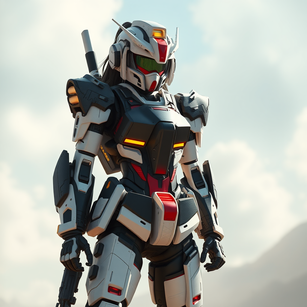 1girl futuristic soldier in a mecha armor, inspired by Gundam, standing dramatically with bold lighting, in the style of a Soldier Of The Future poster, ultra-detailed CG unified 8K wallpaper, using advanced physics-based rendering for realistic texture, high contrast and hyperrealistic photography, vibrant and rich colors capturing the essence of a sci-fi epic.
