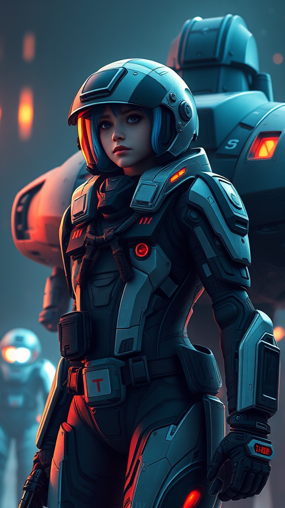 1girl, futuristic warrior, pilot suit, advanced mech, epic poster art, Soldier of Tomorrow, striking lighting, intricate detail, 8K ultra-high-definition wallpapers, physics-enhanced rendering, lifelike depiction, cinematic realism, vivid contrasts, hyper-realistic photography, deep color palette, modern sci-fi aesthetics
