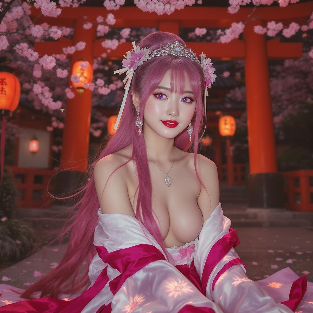1girl, kpop idol, inspired by yae miko, upper body, contemporary style, flowing detached sleeves, bare shoulders, vibrant pink hair, long cascading hair, open attire, high quality details, intricate jewelry, striking purple eyes, elegant earrings, torii gate in the background, surrounded by cherry blossoms, illuminated by soft lantern light, dramatic depth of field, vividly detailed face, focused expression, ribbon accents, modern miko style, radiant skin, long elegant sleeves, gentle smile, essence of East Asian architecture, serene sitting pose.