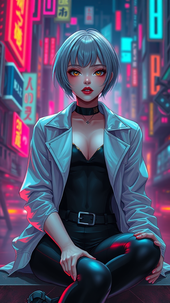 1girl, portrait, sitting, solo, cyberpunk essence, official art style, unity 8k resolution, ultra detailed, stunning and aesthetic, masterpiece quality, glowing skin, the most beautiful chaos in organized form, elegant, a brutalist design with vivid neon hues, touch of romanticism, wide angle shot, intricately designed background, Cyberpunk 2077 anime influenced, adorned with a belt, sleek black bodysuit, pristine white jacket, vibrant red lips, chic short hair, positioned at a distance from the lens.