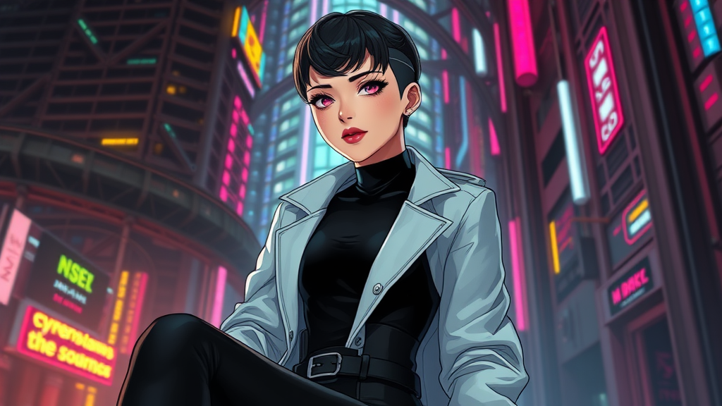 1girl, portrait, sitting, solo, cyberpunk, official art, unity 8k wallpaper, ultra detailed, beautiful and aesthetic, masterpiece, best quality, radiant skin, the epitome of chaos, sophisticated, brutalist architecture, vibrant colors, neo-romanticism, wide shot, intricate background Cyberpunk 2077 Anime Style :0.6> Harness, sleek black bodysuit, crisp white jacket, crimson lips, pixie cut, slightly distant from the lens.
