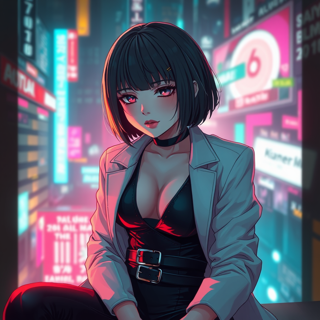 1girl portrait sitting solo cyberpunk official art unity 8k wallpaper ultra detailed beautiful and aesthetic masterpiece best quality radiant skin the most captivating form of chaos graceful in a brutalist ambiance vibrant colors infused with romanticism expansive view intricate background Cyberpunk 2077 anime style belt sleek black bodysuit chic white jacket bold red lips stylish short hair distant from the lens with an air of mystery.