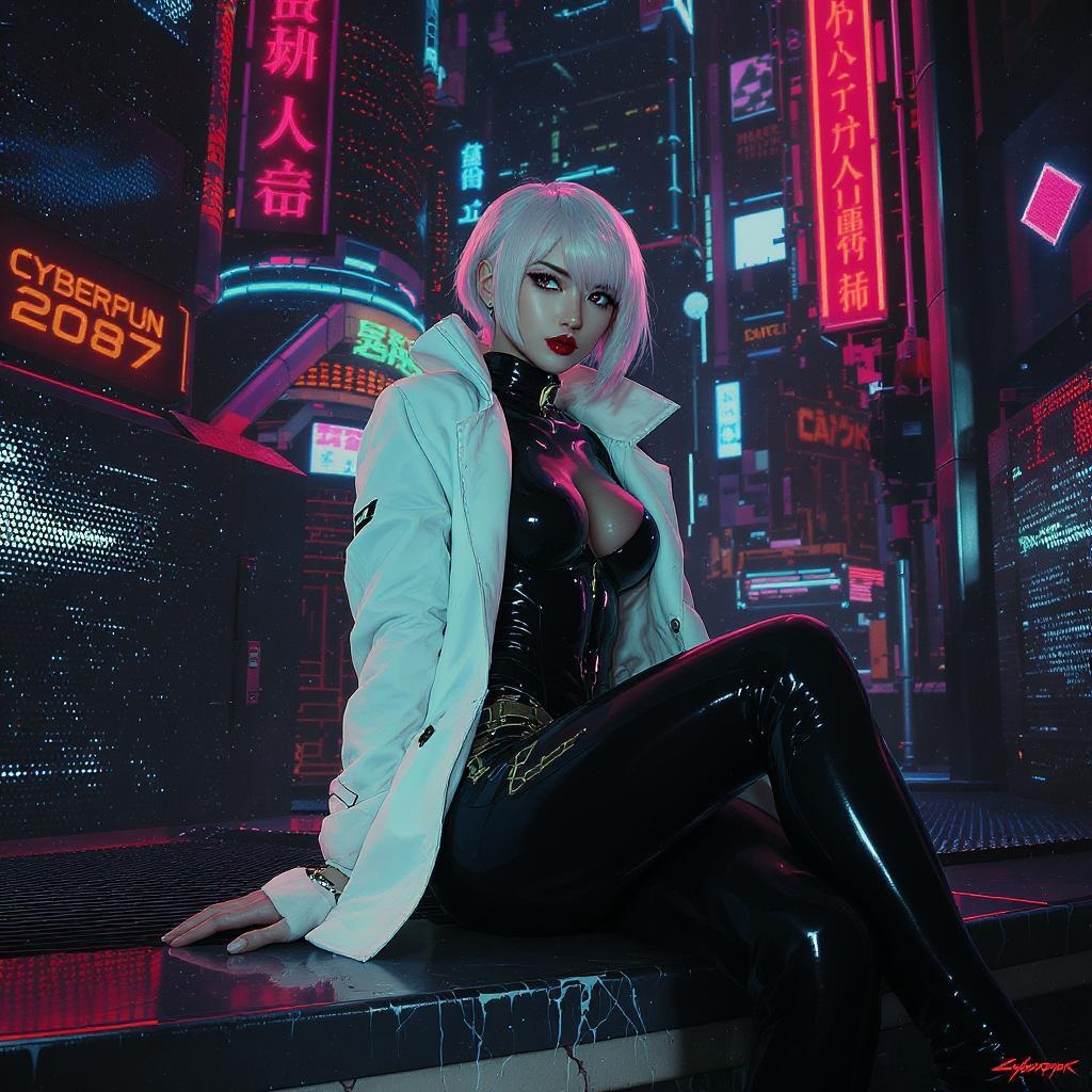 1girl portrait sitting solo cyberpunk official art unity 8k wallpaper ultra detailed beautiful and aesthetic masterpiece best quality glowing skin the most beautiful form of chaos elegant brutalist design vivid colors romanticism wide shot detailed background Cyberpunk 2077 Anime Style 0.6 belt black bodysuit white jacket red lips short hair distant from lens futuristic cityscape neon lights reflective surfaces dynamic composition moody atmosphere intricate patterns subtle metallic accents