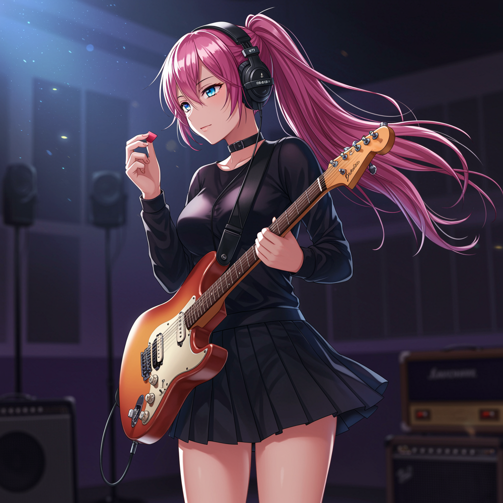 1girl, solo, dark skirt, bright blue eyes, electric guitar, musical instrument, headphones on, plectrum in hand, long flowing hair, vibrant pink hair, musical setting, one side ponytail, performing guitar, pleated black skirt, stylish black top, indoor scene.