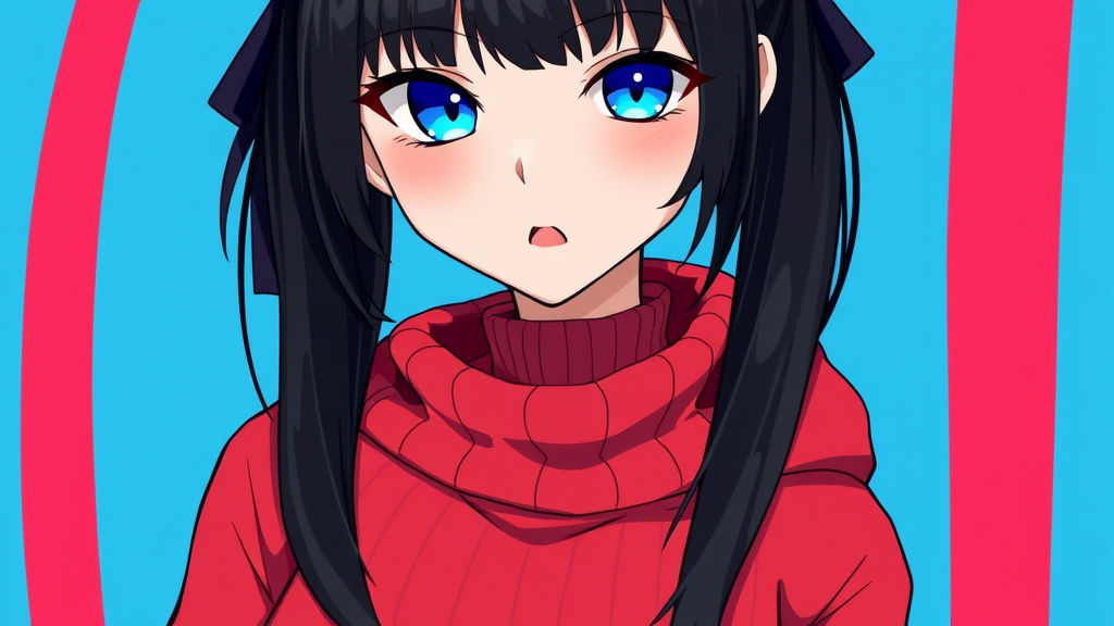 1girl, solo, long hair, black hair, red hoodie, midriff, looking at viewer, blue background, simple background, seductive expression, lips, sexy mouth, ribbon, hair ribbon, bangs framing the face, turtleneck sweater, upper body focus, partial side view, turtleneck, striking blue eyes, black hair ribbon, ribbed texture on hoodie, twintails hairstyle, defined nose, a blend of modern and playful style, 3D appearance, sleek aesthetic.