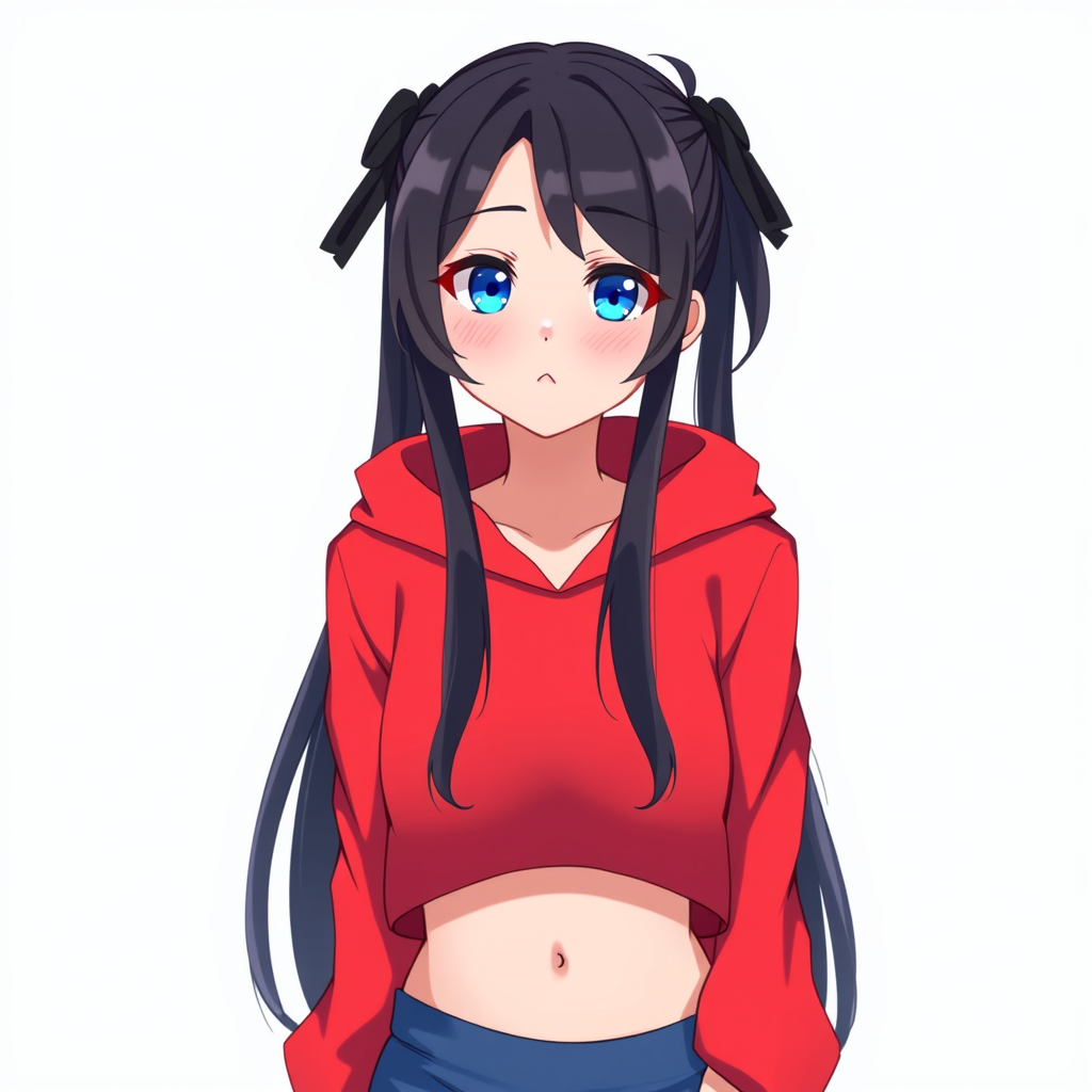 1girl, solo, long hair, hoodie, bright red hoodie, midriff, looking at viewer, light blue gradient background, black hair, minimalist background, gentle features, full lips, sensual mouth, black hair ribbon, hair tied up in twintails, side parted bangs, blue eyed bangs, small nose, upper body, clean skin, few freckles, soft focus, digital art style, vibrant colors, slight blur.