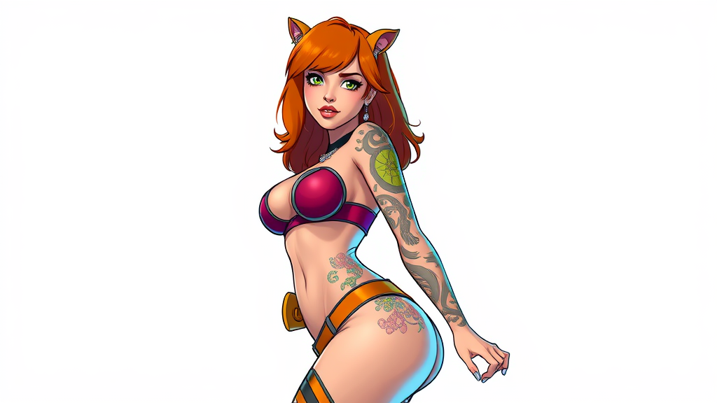 1girl, solo, Velma from Scooby Doo in a stylish and revealing outfit, vibrant illustrative style, showcasing a curvy figure with tattoos, set against a simple background, ultra-high-definition image, vivid colors, realistic detail in the style of niji3d, cinematic composition, focused and clear without artifacts, artistic rendition, no signatures or watermarks, seamless visual, single perspective, accurate anatomy, unmasked, sharp clarity.