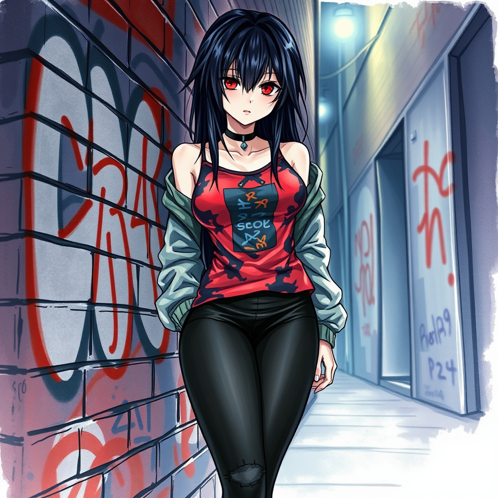 1girl, thick thighs:1.8, black pantyhose:1.2, detailed design, chromatic effects, long black hair, messy strands, red highlights, hair partially covering one eye, intense red eyes, focused gaze, choker necklace, vibrant shirt, ripped leggings, open jacket, leaning against a graffiti-covered brick wall, dimly lit alley, watercolor effect, artistic touch, sketch-like quality, soft focus, vivid backlight, subtle imperfections, unique style, adult theme, mature tone, additional limbs not included, distinct silhouette, imaginative flair, characterized elegance, urban vibe, modern art influence, striking allure, complex shading, enigmatic presence.