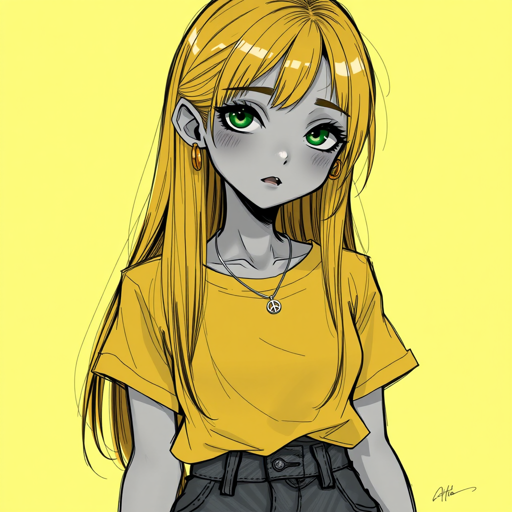 1girl, upper body, character portrait, trending on Artstation, digital art, render of a girl, long straight hair, sunburst yellow hair, beautiful artwork illustration, highly detailed, 8k, almond green background, dark banana yellow shirt, dark emerald green eyes, simple design clothes, jeans, 20 years old, matured, weight gained, golden earrings, silver simple necklace, embarrassed, monochrome, zombie theme, overexposed, sketch-like quality, unique character design, creative anatomy, expressive face, subtle horror elements, intricate geometry, artful imperfections, strings and lines interwoven, hint of surrealism, subtle fruit motifs, peaceful expression with a peace sign accessory.