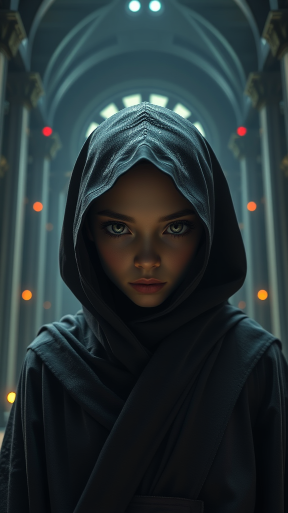 1girl wearing dark robes in a Star Wars temple background, symmetrical eyes, dramatic lighting, realistic, sharp focus, HD, highly complex, intricate, photography, hyperrealism, raytracing, physics-based rendering, poster of a Sith Lord from Star Wars, wide angle, extreme details, full body shot, cinematic color grading, depth of field, beautifully color-coded, Unreal Engine, editorial style, shot on 70mm lens, depth of field, shutter speed 1/1000, F/2, white balance, 32k, super-resolution, megapixel quality, VR, moody natural and incandescent lighting, optical fiber accents, volumetric and contre-jour lighting, studio and soft lighting for a dramatic effect, global and ray tracing illumination, shadows and ray traced reflections, chromatic aberration, high-detail shaders, post-production cell shading, tone mapping, painted concept art style, extremely detailed and intricate with a hyper maximalist and elegant design, dynamic pose, ultra-photorealistic with high contrast and ambient occlusion, emphasis on volumetric lighting for a vivid full-color depiction.