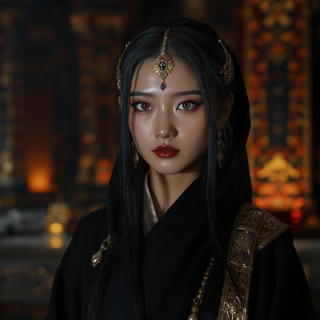 1girl wearing dark robes in a temple with symmetrical eyes, dramatic lighting, realistic and sharp focus. HD, highly complex and intricate, hyperrealistic photography with raytracing and physics-based rendering. High detail RAW color photo, ultra high resolution, highly detailed 8K CG wallpapers featuring elaborate jewelry. Incorporates elements of CGI, illustration, and digital painting. Avoids low resolution, text errors, poor quality, jpeg artifacts, and distortion. Maintains correct anatomy and proportions, with no extra limbs or mutated features.