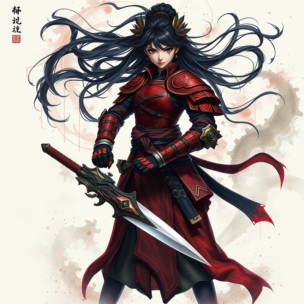 1girl, wearing elaborate red armor with intricate detail, black hair cascading in graceful waves, intense black eyes focused on the viewer, standing solo against an ethereal, abstract background reminiscent of ink wash painting, her stance emanating strength as she grips a unique weapon, arm guards featuring delicate designs, a hint of blood subtly accentuating her fierce expression, her floating hair and the armored details captured in ultra-realistic, 32k resolution evoking a sense of power, tabi-clad feet rooted in the traditional yet artistic setting, the entire image a masterpiece of fractal art and CG unity, epitomizing the best quality visual storytelling.
