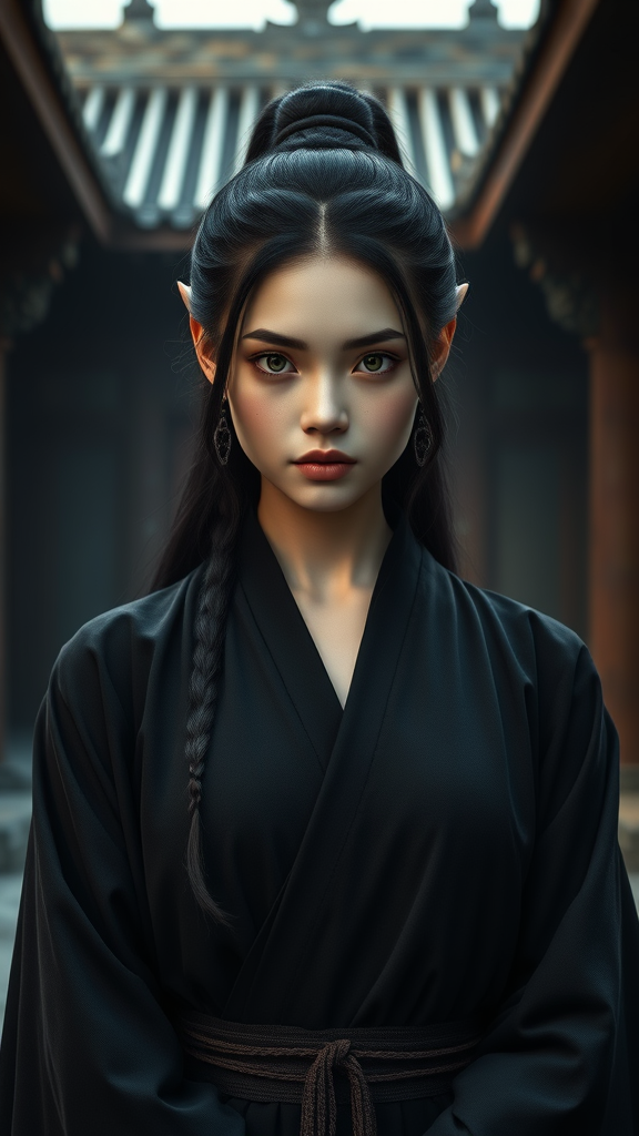 1girl, wearing elegant dark robes, set in a serene temple background, symmetrical features, captivating dramatic lighting, realistic with sharp focus, HD quality, showcasing complexity and intricacy, photography that leans into hyperrealism with precise raytracing, employing physics-based rendering techniques, high detail with RAW color photo, ultra-high resolution imagery, creating highly detailed 8K wallpapers, evoking a sense of unity and harmony. Avoid elements such as cgi, 3d, cartoon, anime, illustration, and digital painting, ensuring no low resolution, text, errors, cropped content, or poor quality. Emphasize realistic anatomy and proportions, avoiding distortions, duplicates, or any deformities, focusing on an enhanced and lifelike representation.
