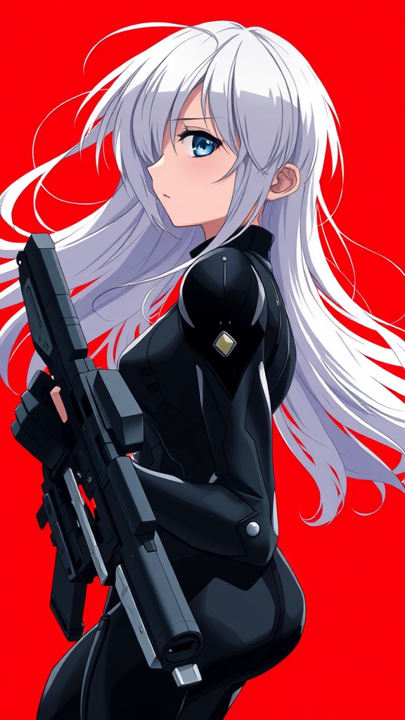1girl with a captivating and intricately detailed face and striking eyes, sporting flowing white hair and clad in a sleek black mecha suit. She is posed in a side view, holding a futuristic gun, set against a vivid red backdrop that complements the simplicity of the scene. The image exudes a minimalist yet powerful aesthetic with an emphasis on fisheye perspectives, emphasizing its animation-like quality. The composition radiates as a masterpiece of official art, balancing beauty and elegance, capturing her mid-action with a subtle emphasis on posture.