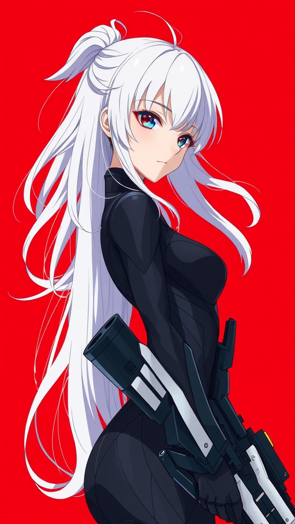 1girl with a stunning and detailed face and mesmerizing eyes, flowing white hair, clad in a sleek black mecha suit, minimalist style, holding a futuristic weapon, side profile, vivid red backdrop, simplistic background, fisheye perspective, creating a masterpiece of high quality, capturing a sense of official animation art, both beautiful and aesthetic, dynamic pose with a slight twist for added intrigue.