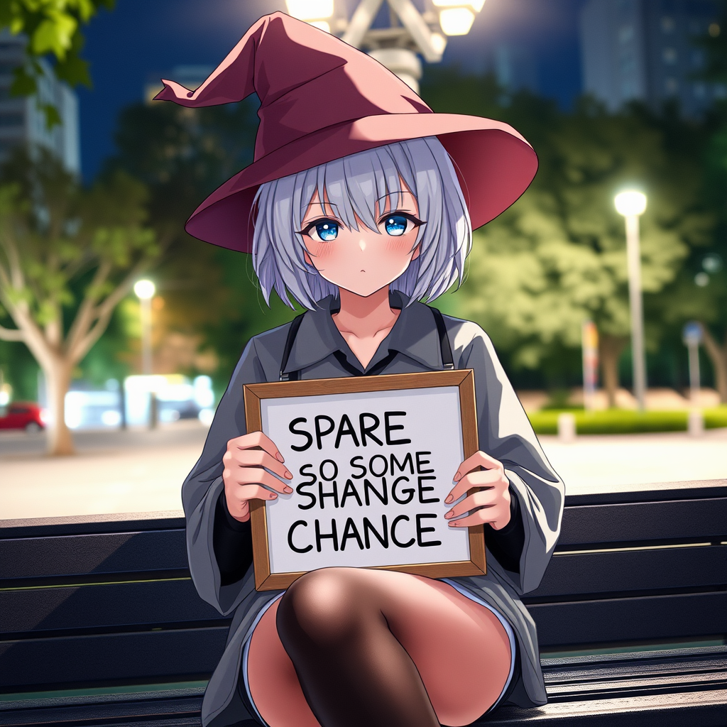 1lady, solo, charming, white short hair, wizard hat, close-up, shadowed face, oversized shirt, long socks, text, holding sign board with "SPARE SOME CHANGE", shorts, black thigh highs, neutral expression, lounging, sitting on bench, vacant eyes, park, urban, scenery, night, depth of field, stunning, top quality 2D, clear, well-composed, natural anatomy, centered, realistic, defined, unique, warm atmosphere.