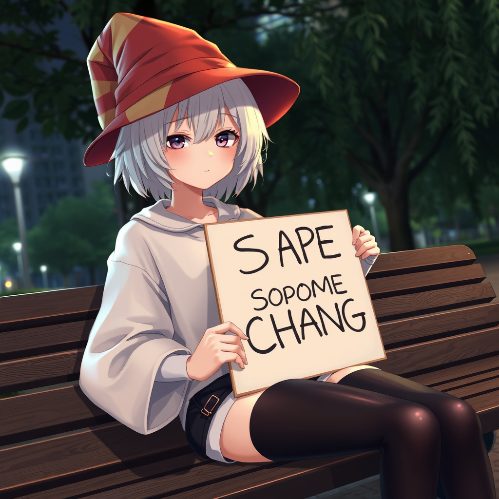 1lady, solo, charming, white short hair, wizard hat, close-up, softly shaded face, oversized shirt, long socks, holding a sign that says "SPARE SOME CHANGE", shorts, black thigh highs, calm expression, lounging on a bench, vacant eyes, park, urban backdrop, nighttime, depth of field, stunning detail, high-quality 2D, realistic anatomy, clear composition, centered, natural body position, balanced features, smoothly defined, clear.