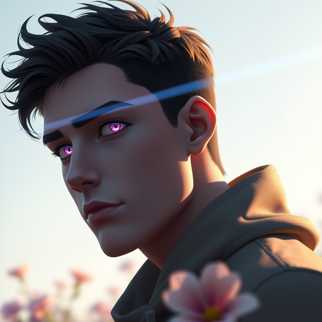 1man, solo, piercing purple eyes, finely detailed, breathtaking, cinematic lighting, daytime, dynamic lighting, simple background, depth of field, CG, casual clothes, flowers, error, cropped, low quality, normal quality, jpeg artifacts, side view, blurry, cgi, 3d, plain, casual, youthful, bold, mature, masculine.