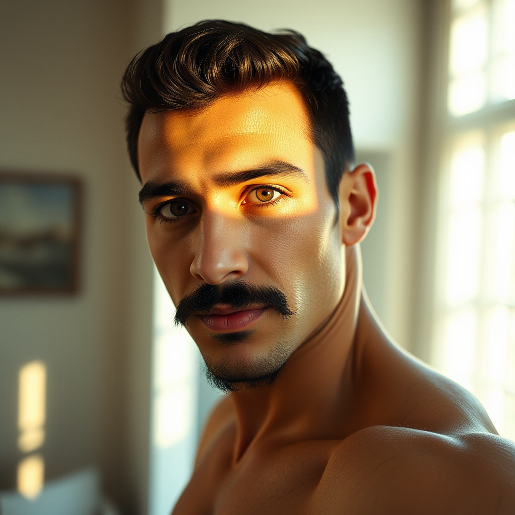 20-year-old, athletic, Persian Iranian wrestler, strikingly handsome, male, mustache, full-body portrayal, hyper-realistic image, captivating man with ray tracing, flawless pupils, serene expression, impeccable eyes, ideal human anatomy, self-portrait in mirror using iPhone 14, short black hair, inviting well-lit room, subtle film grain effect, Kodak Portra 800, f1.8, bathed in golden hour glow, gentle warm light streaming in.
