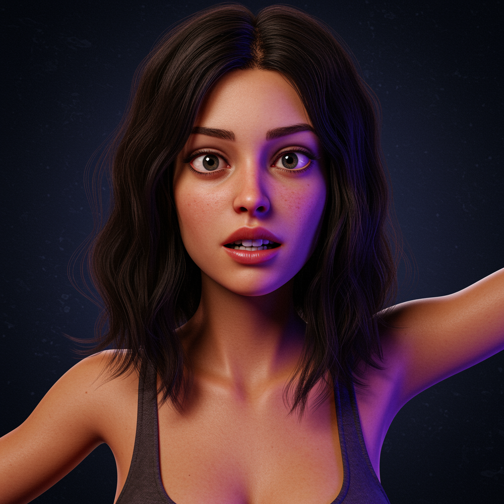 20-year-old brunette woman portrait, full body, captivating face, detailed expression, cinematic lighting, stunning and ultra-realistic, inspired by a blend of artistic styles. Featuring unique imperfections such as unusual eye shapes and characterful teeth, this portrayal combines elements of anime and 3D render. Embrace the charm of asymmetry with imaginative features like overlapping eyes or unexpected facial details. Boldly utilizing vibrant, saturated colors to enhance visual impact, the depiction explores the beauty in unconventional anatomy with creativity and intrigue. An artistic interpretation that embraces playful elements, from interesting limb composition to non-standard proportions, aiming for an engaging visual narrative that celebrates the beauty of imperfection and artistic expression.