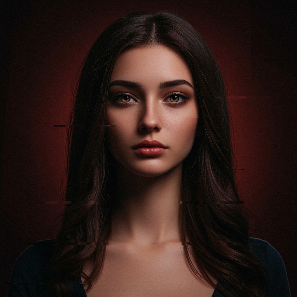 20-year-old brunette woman, full body portrait, beautiful and deliberate, featuring a cinematic and ultra-realistic quality with perfect facial features. The imagery evokes a sense of artistic mastery, highlighting the woman's striking amber eyes and long neck, set against a backdrop of rich and saturated colors. Despite the realistic portrayal, a surreal twist emerges with subtle elements of anime-inspired design, introducing unique and unexpected details such as elongated limbs and whimsical proportions. The composition plays with a dream-like atmosphere, where glitchy accents and abstract features add an artistic flair, culminating in a blend of reality and imagination.