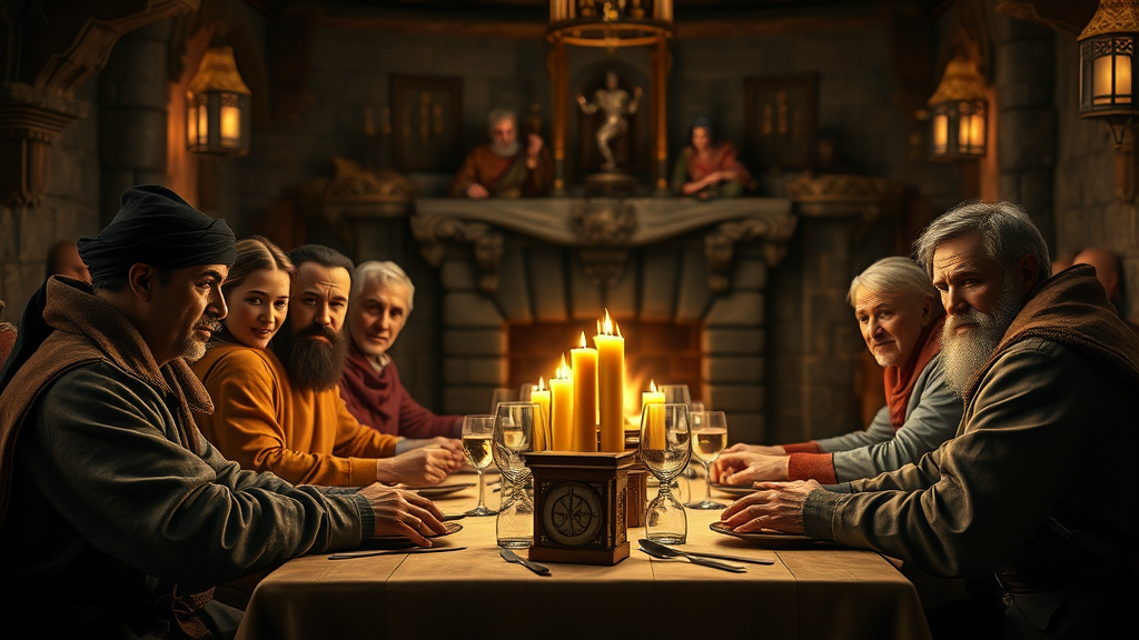 200mm lens, cinematic shot, award-winning CGI, perfect angle, sitting, having a meal together, last supper-inspired setting, cozy, surreal, epic composition, detailed medieval bar interior background, fireplace, hard focus, smooth, raytracing, specular lighting, depth of field, volumetric lighting, reflection, light reflection, octane render, 3D renders, HD, UHD, masterpiece, professional work, emphasized character expressions, intricate details, atmospheric mood, dynamic lighting, harmonious color palette, balanced arrangement with distinct personalities, intriguing storytelling elements, vivid textures, rich visuals, inviting warmth of the setting.