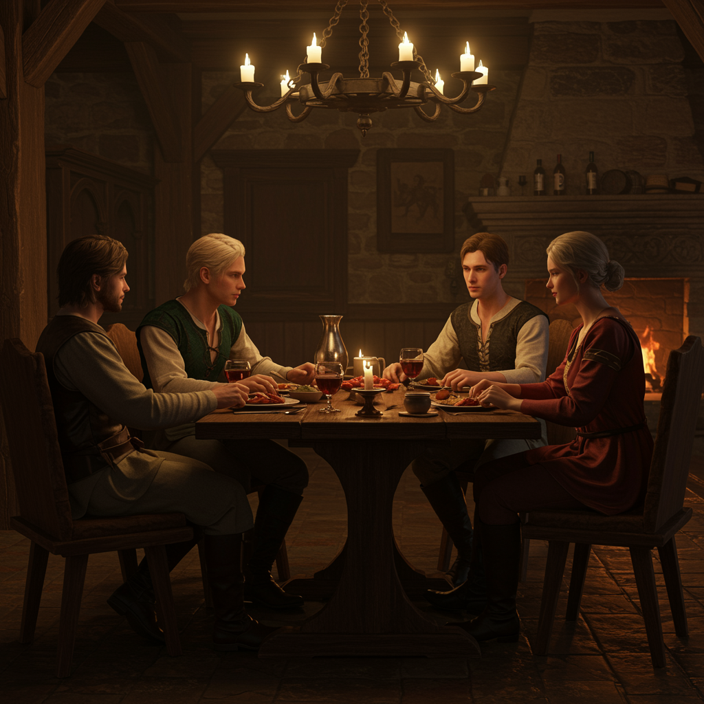 200mm lens, cinematic shot, award-winning CGI, perfect angle, sitting, having a meal together, last supper theme, cozy, surreal, epic composition, detailed medieval bar interior background, fireplace, hard focus, smooth, raytracing, specular lighting, depth of field, volumetric lighting, reflection, light reflection, octane render, 3D renders, HD, UHD, 64K, 128K, masterpiece, professional work, harmonious composition, natural poses, immersive atmosphere, detailed table setting, rich textures, elegant costumes, authentic character expressions, warm ambient lighting, intricate detailing, narrative-driven composition, coherent storytelling, seamless integration of elements, inspired by classical art.