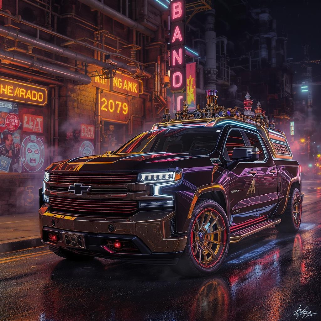 View this AI-generated image featuring 2027 silverado reimagined with a steampunk and cyberpunk 2077 aesthetic featuring a futuristic concept design the vehicle boasts an altered shape with a sleeker front end intricately detailed brass and copper accents glowing neon highlights and advanced technol