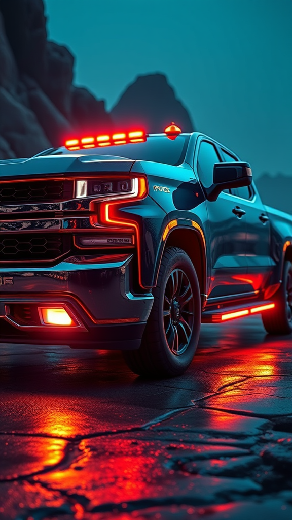 2027 Silverado reimagined with a fusion of steampunk and Cyberpunk 2077 aesthetics, featuring a futuristic concept design. The iconic truck boasts an altered shape with a sleeker front end, showcasing intricate industrial details and glowing neon accents. Its body is adorned with brass and copper elements, seamlessly blending the ruggedness of a classic Silverado with avant-garde technology. This visionary design captures the essence of a futuristic landscape, where vintage elegance meets high-tech innovation.