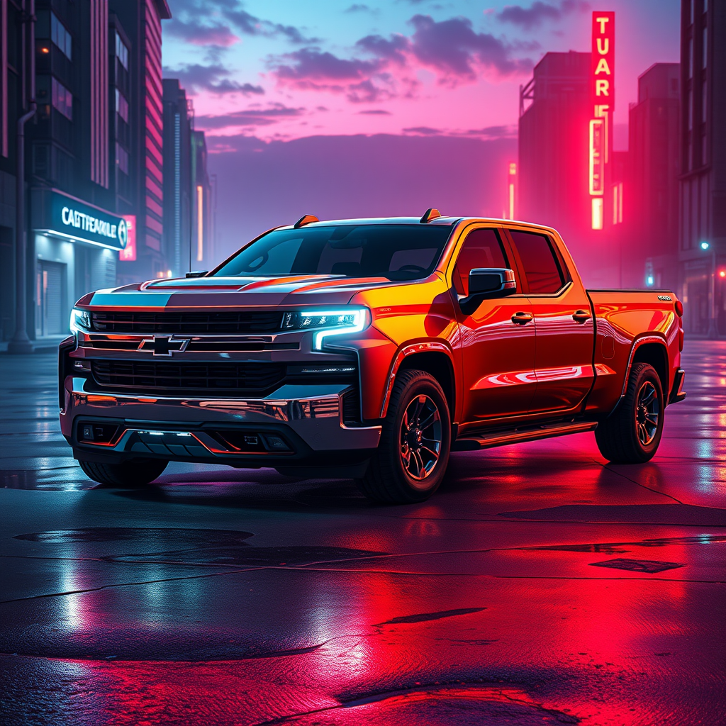 2077 cyberpunk futuristic Silverado pickup truck concept, sleek design, advanced technology, neon lights glowing against chrome finishes, rugged yet sophisticated, urban landscape backdrop, inspired by Syd Mead's visionary art style, blending industrial aesthetics with futuristic innovation, reimagined classic with cutting-edge enhancements, dynamic contours and aerodynamic lines, digital interface and holographic displays.