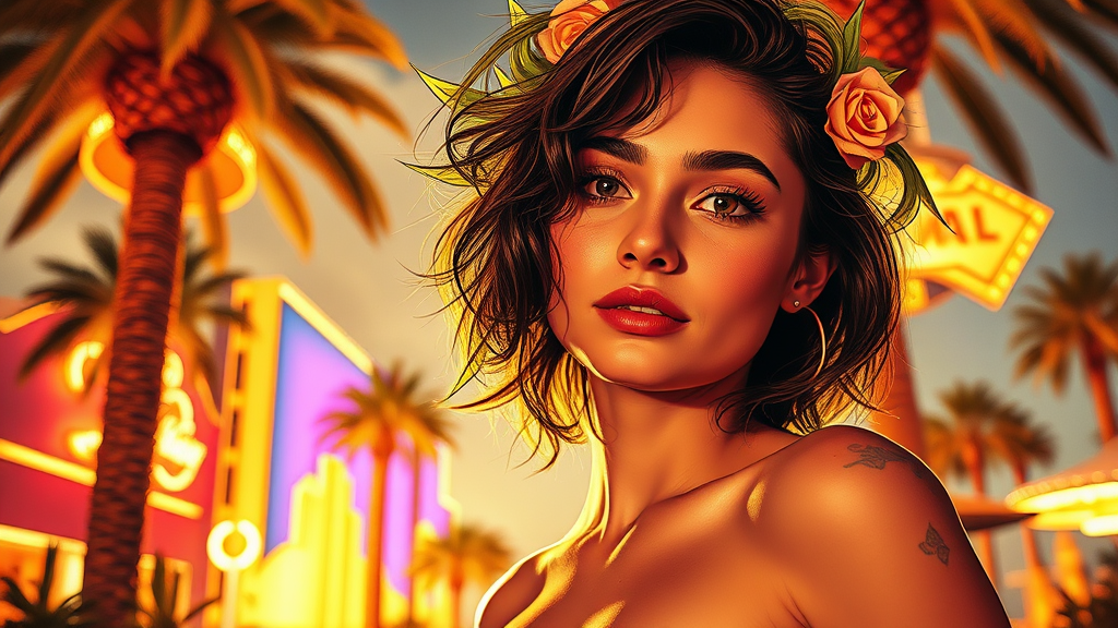 21-year-old woman, finely detailed, quality, dramatic, ray tracing, photograph, Ornate Tropical Las Vegas, golden hour, ultrarealistic, queercore art, broad lighting, film grain, film camera, circular polarizer, sepia tones, Instagram aesthetic, UHD, DSLR 3D, drawings, abstract art, cartoons, surrealist painting, conceptual drawing, graphic elements, collage style, evocative letter included, tastefully nude composition.