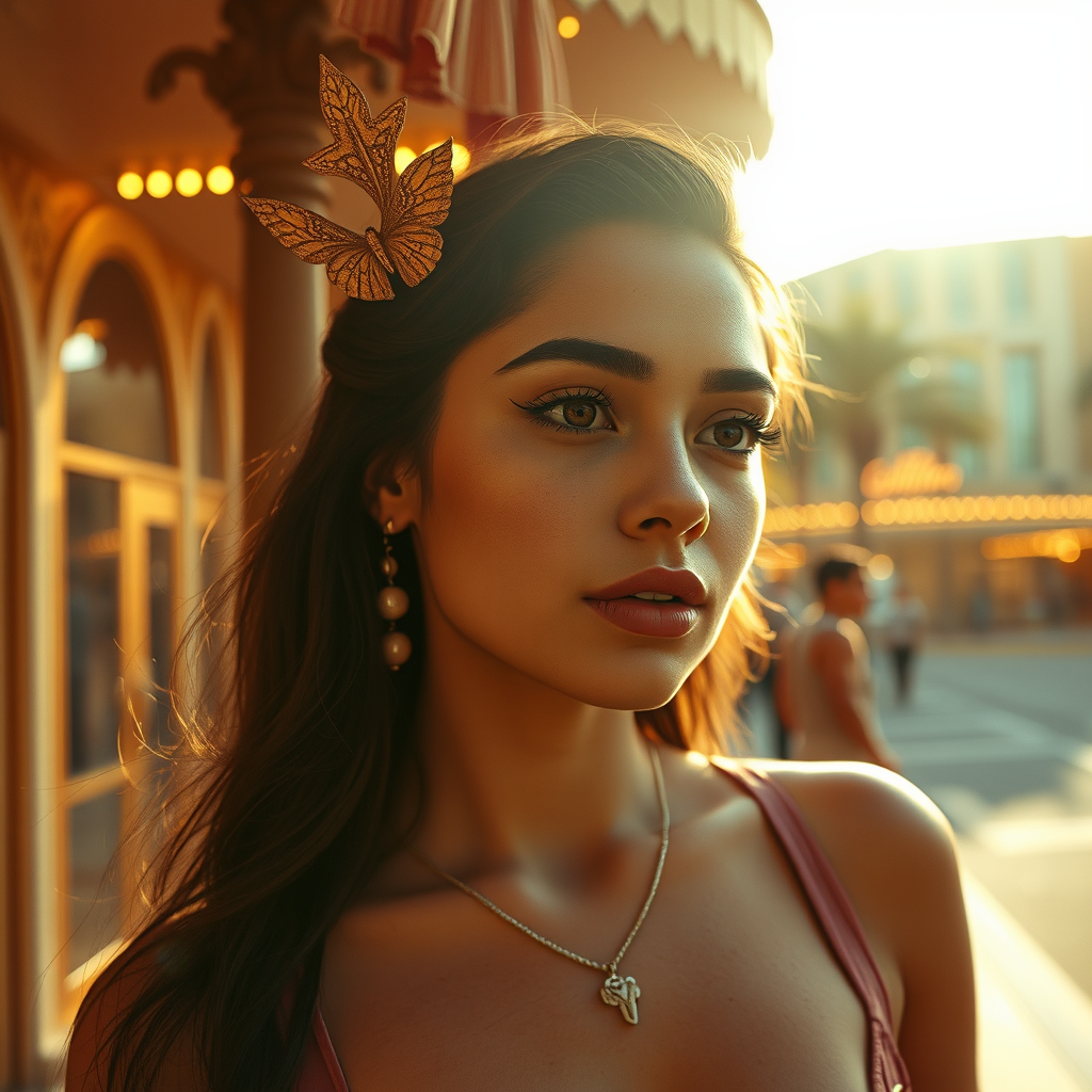 21-year-old woman, intricately detailed, high-quality, dramatic ambiance, ray tracing effect, capturing Ornate Tropical Las Vegas at Golden Hour, ultrarealistic with a Queercore Art influence, broad lighting for depth, infused with film grain texture, shot on a classic film camera using a circular polarizer, enhanced by a sepia filter. The scene evokes an Instagram-friendly, UHD quality, blending dslr 3d aesthetics with elements of drawings, abstract art, and cartoon-like surrealist painting. Conceptual drawing and graphic collage elements merge seamlessly, creating a narrative that is suggestive yet tastefully artistic.